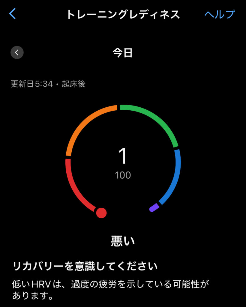 トレーニングレディネスの値を見たら、なんと「1」。