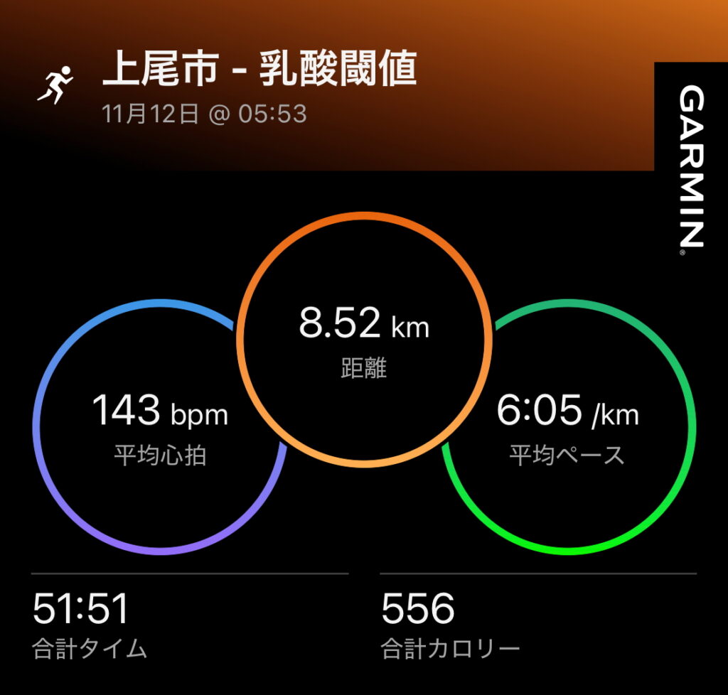 週の折り返し。Garminコーチのメニューどおり今日は閾値走を実施。