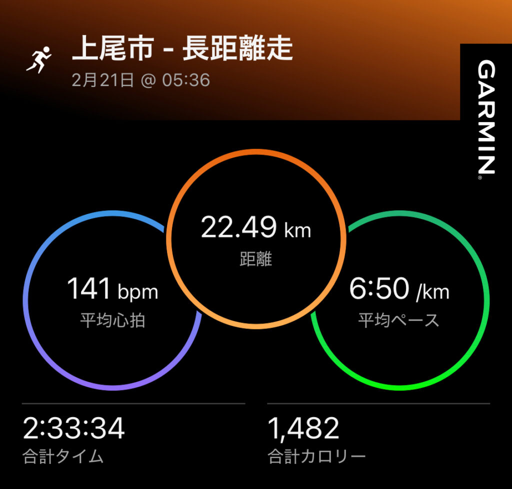 今日のロングジョグは距離22.49km、タイム2時間33分34秒、平均ペース6:50/kmだった。消費カロリーは運動消費1,482kcalで、週末に集中するロング走としては十分な負荷になった。平日のGarminコーチはほぼ崩れた週だったけど、土曜のロングで週のメイン刺激は確保できた。