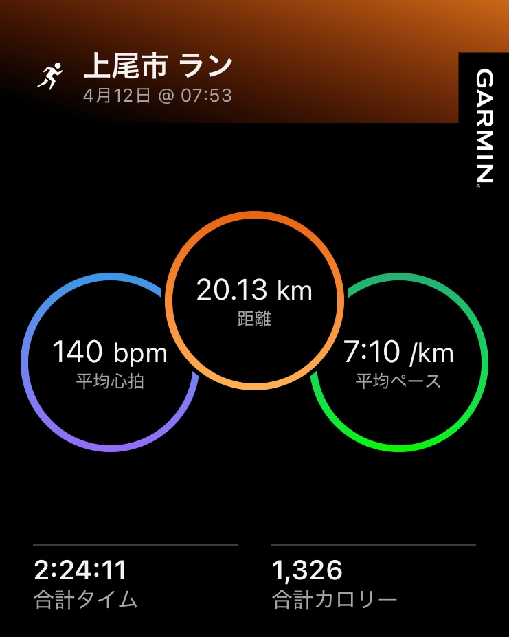 結果は2:24:11、平均7:10/km、平均心拍140bpm、最大157bpm。トレーニング効果はベース3.8。自己評価は4/10。ややハードと出ているが、主観的ダメージは軽い。ここが重要。